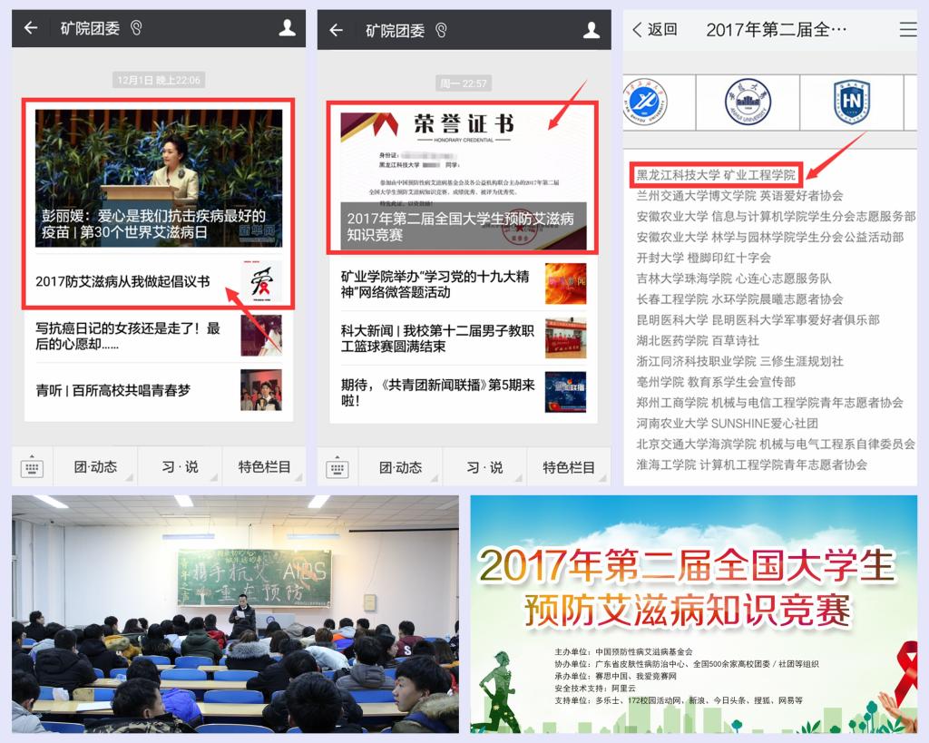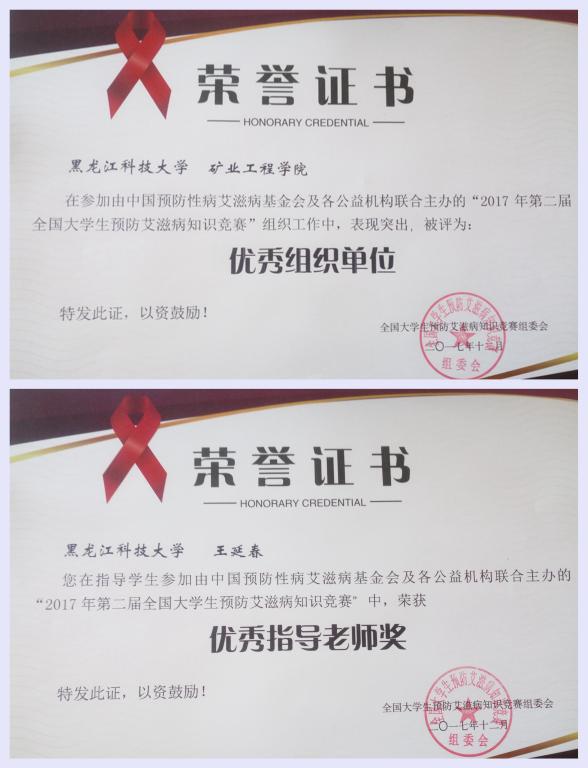 12月31日,由中国预防性病艾滋病基金会主办、多家单位承办的“2017年第二届全国大学生预防艾滋病知识竞赛”落下帷幕。我校矿业学院作为全国500余家高校团委/社团等组织其中之一积极承办了本次活动。参赛期间,矿业学院积极积极筹备、扎实推进,共组织300人参赛,由于表现突出,学院荣获“优秀组织单位”荣誉称号,辅导员王延春荣获“优秀指导教师奖”,宋雨薇等同学荣获“优秀志愿者”荣誉称号。