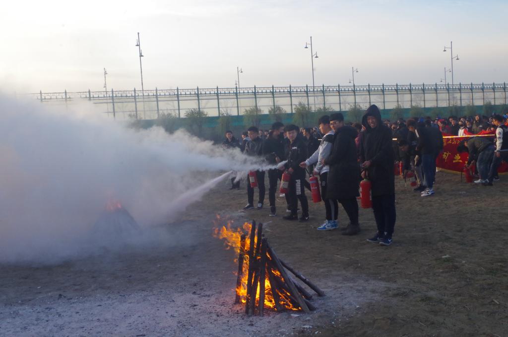在安全疏散地点清点人数无误后,主要学生干部和2017级全体学生参加了在篮球场旁组织的灭火实战演习,演习由辅导员徐龙主持。首先,保卫处赵铁山老师讲解了灭火器的正确使用方法以及日常寝室用电的安全注意事项;随后,学院领导、老师以及各班学生代表上前实际操作了灭火器的使用。