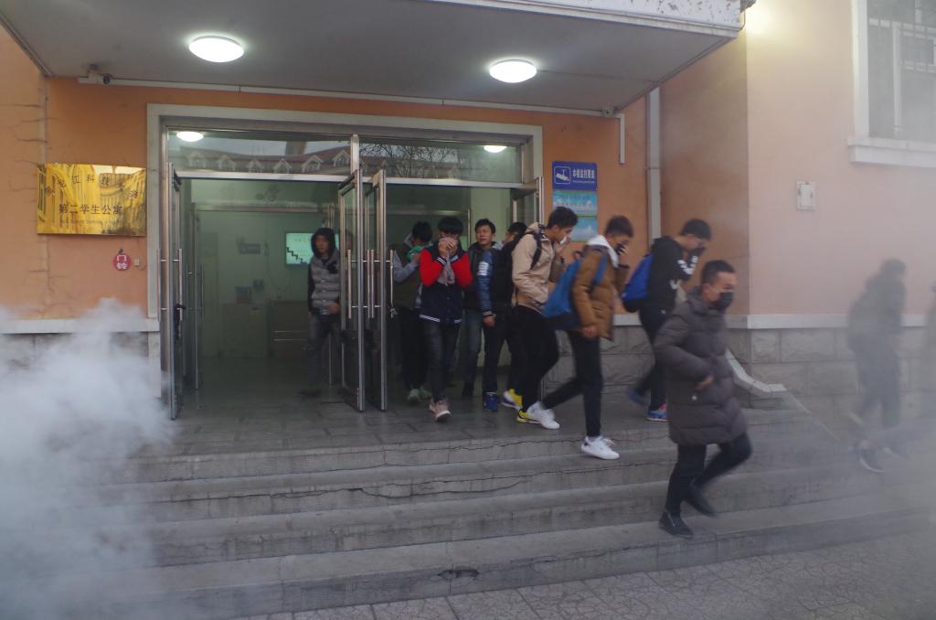 早6:30分,随着消防警报的响起,在第二学生公寓门口引燃烟雾弹,学生在老师的组织下,用湿毛巾捂住口鼻,互相搀扶,紧张、有序的按照预定的路线撤离,整个疏散过程仅用了5分钟时间。