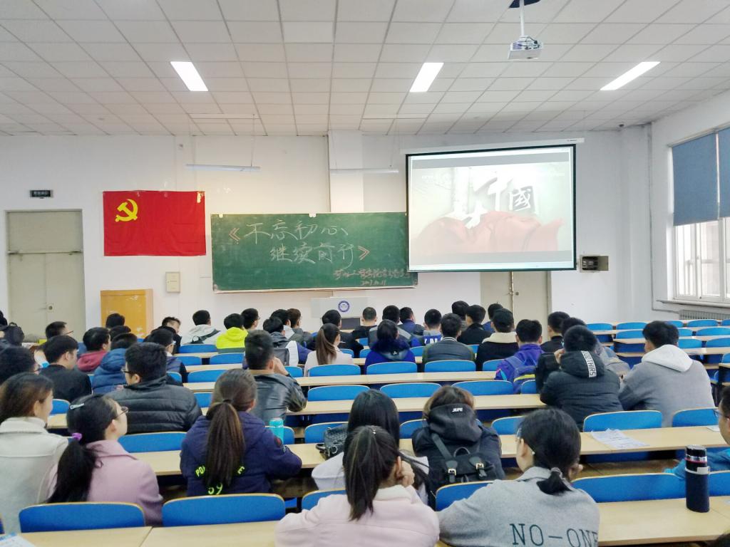 10月11日中午,矿业学院学生党支部在主楼EN0101召开全体党员大会,集中学习观看了电视政论片《不忘初心 继续前行》的第一集《举旗定向》。学院学生第二党支部书记王延春出席会议。