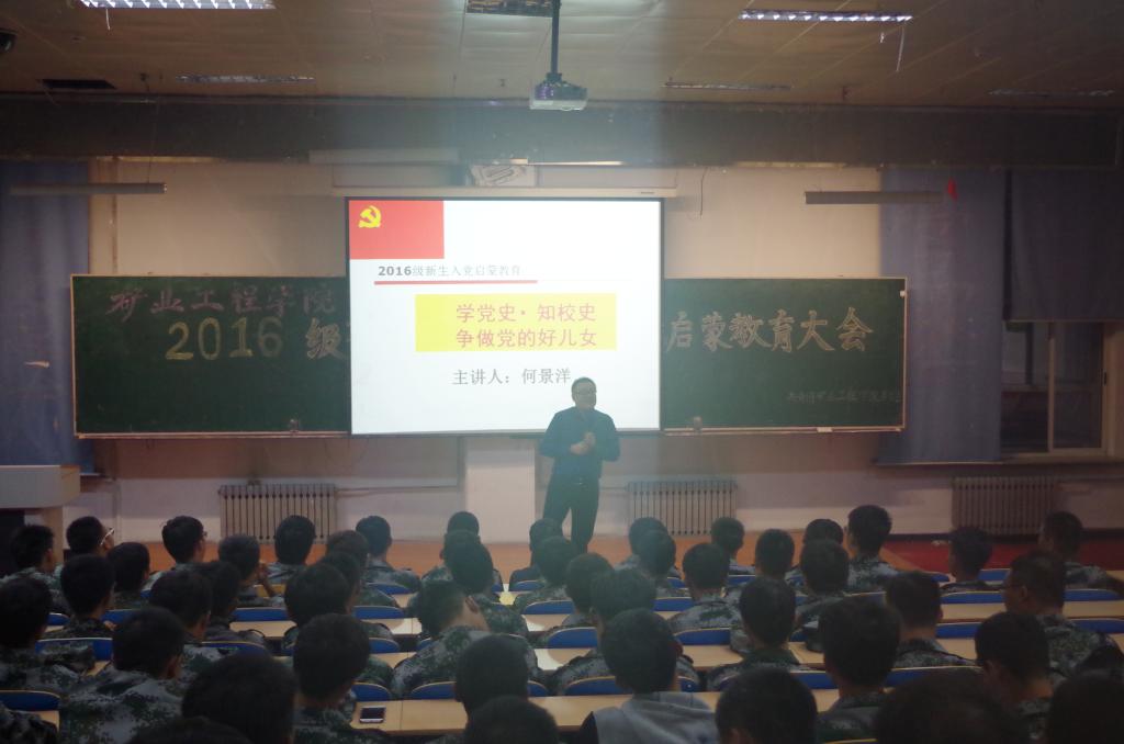为了让我新生更好地了解校史校情,以及扎实掌握入党要求和入党程序,提高思想政治素质,按照入学教育方案的总体安排,9月10日晚,矿业学院在主楼西区WN0401召开了“2016级新生校史校情暨入党启蒙教育大会”。大会邀请到校党委宣传部常务副部长何景洋老师担任主讲嘉宾。大会由学院分团委书记孟祥瑞主持。