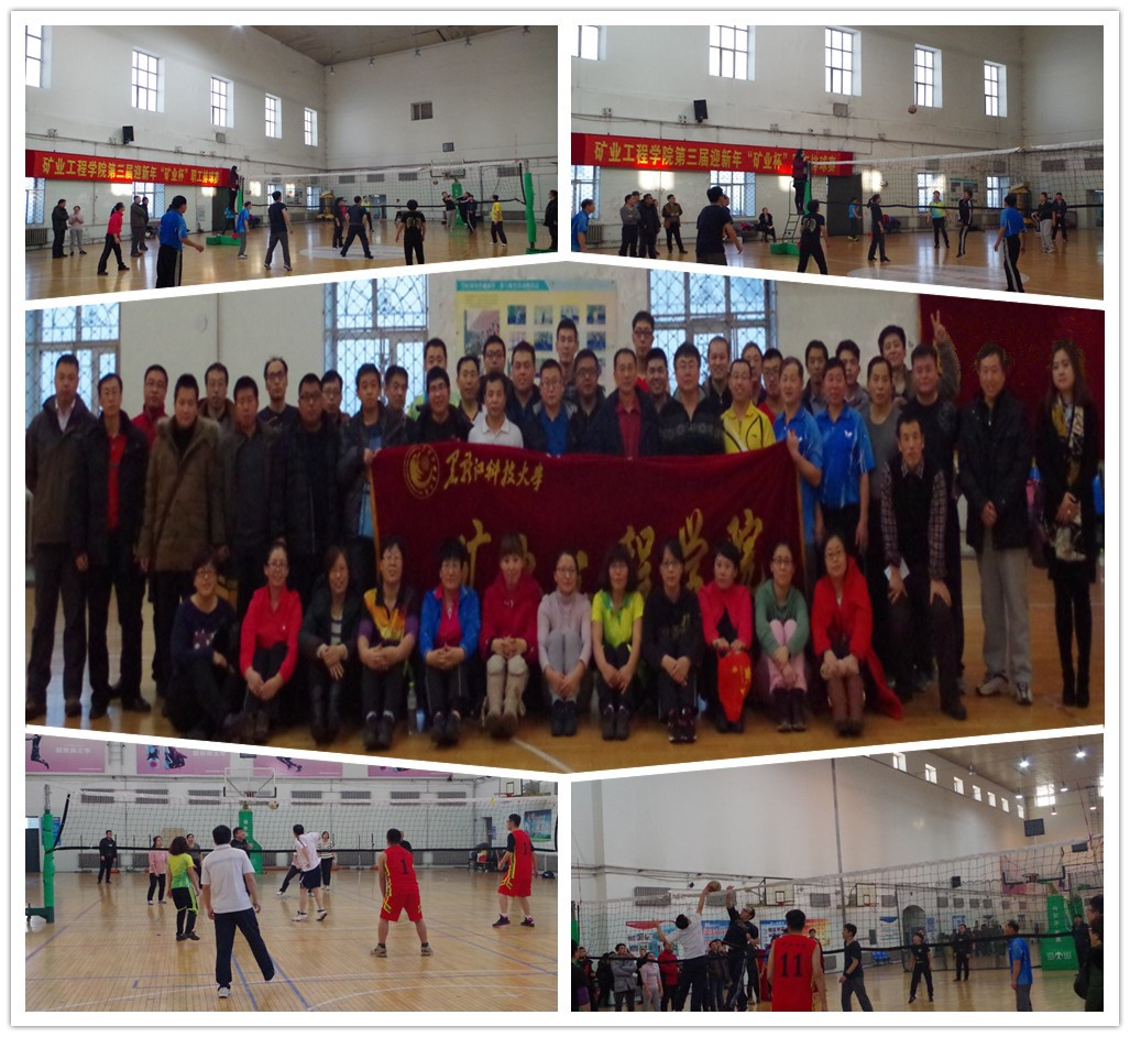 值此2016年新年来临之际,为进一步丰富教职工的文化生活,激发广大教职工强身健体意识,促进身心健康,以更加饱满精神投入到科技大学内涵建设当中,12月29日下午,矿业工程学院在体育馆举办了第三届迎新年“矿业杯”职工排球赛。