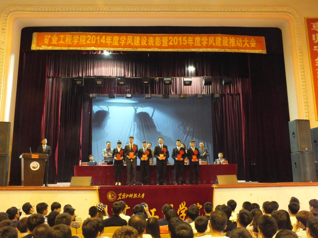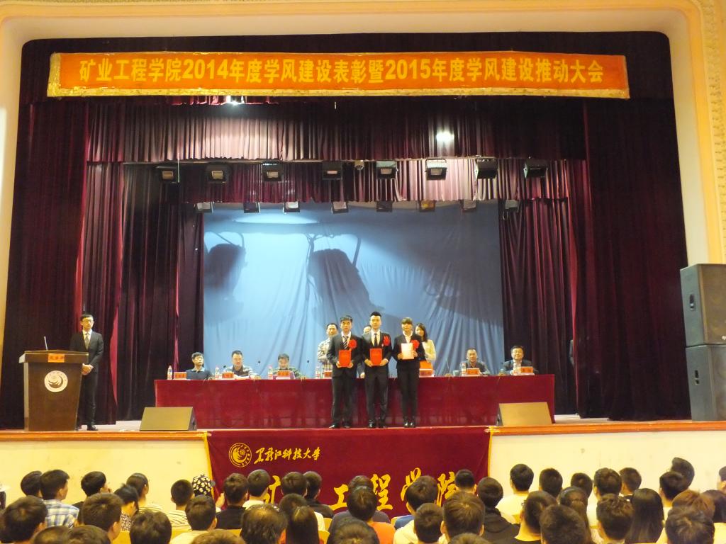 本次会议共有二项议程。一是副院长康健宣读了《矿业工程学院关于表彰2014年度学风建设先进集体和先进个人的决定》,与会领导向受表彰的先进集体和个人代表颁奖;二是学风建设先进班集体代表王愿、考研典型代表董旭、就业典型代表王启南分别进行了典型经验交流。