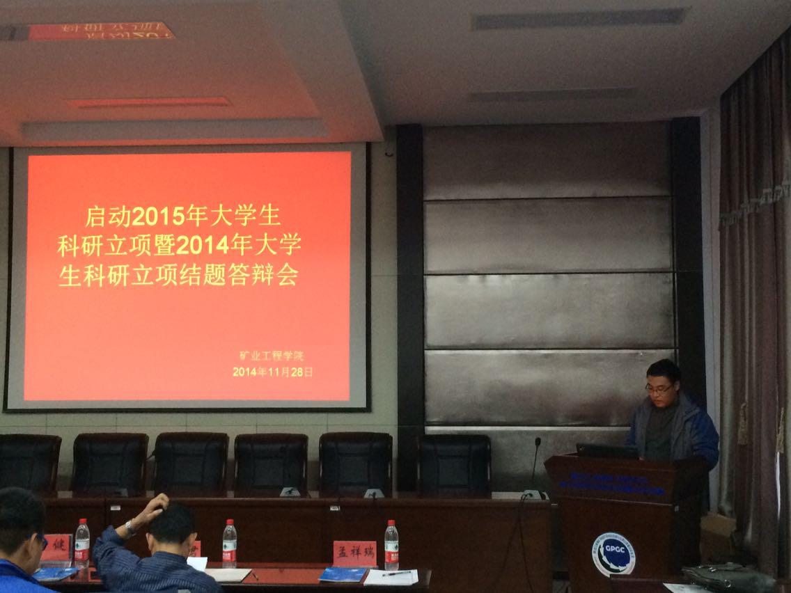 按照校团委下发的《关于开展2014年大学生科研立项检查和结题验收工作的通知》的有关要求,为了切实做好我院大学生科研立项各项工作,总结取得成果,11月28日下午,在学院二楼会议室召开了“矿业工程学院启动2015年大学生科研立项暨2014年大学生科研立项结题答辩会”。副院长康健、城乡专业教研室主任王兰霞、采矿专业教师陈刚、矿加专业教师沈笑君担任本次评委,答辩会由矿业学院团委书记孟祥瑞主持。