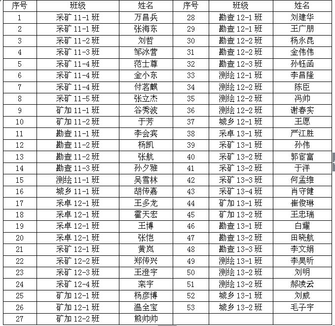 根据我校下发的有关评定国家奖学金、国家励志奖学金和国家助学金的通知及相关要求的规定,按照《矿业工程学院国家奖学金、励志奖学金和助学金评选方案(暂行)》的文件精神,经本人申请、班级评议推荐以下47名同学申请2013-2014学年国家励志奖学金,为发扬民主,广泛听取意见,现将申请国家励志奖学金的47名学生名单公示如下: