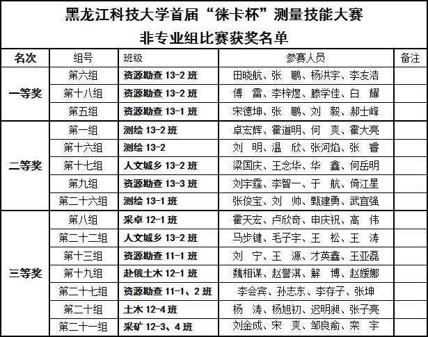 本次非专业组比赛共有32支参赛队伍,分别来自黑龙江科技大学的采矿工程、资源勘查工程、地质工程、安全工程、人文地理与城乡规划、土木工程、赴俄土木、城市规划、测绘工程(大一学生)等9个开设《测量学》课程的专业。