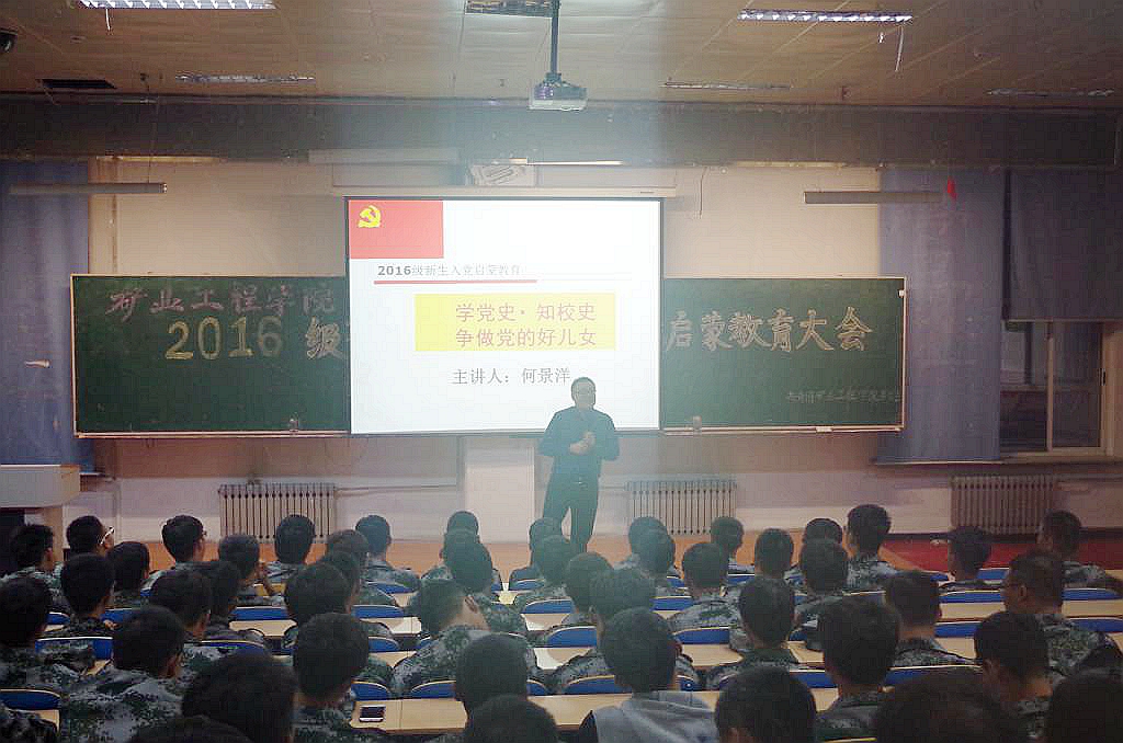为了让新生更好地了解校史校情,扎实掌握入党要求和入党程序,提高思想政治素质,按照入学教育方案的总体安排,9月10日晚,矿业学院在主楼西区WN0401召开了“2016级新生校史校情暨入党启蒙教育大会”。大会邀请到校党委宣传部常务副部长何景洋老师担任主讲嘉宾。大会由学院分团委书记孟祥瑞主持。