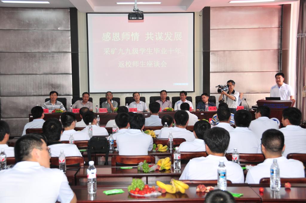 7月6日上午10:00,主题为“感恩师情、共谋发展,采矿九九级学生毕业十年返校师生座谈会”在矿业工程学院二楼会议室举办,60余名毕业生返回母校,重叙师生情、同学情、兄弟情,并向矿业工程学院和安全工程学院捐赠了纪念品。
