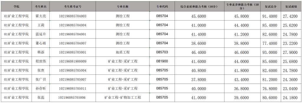矿业工程学院2026年硕士研究生招生考试一志愿复试成绩
