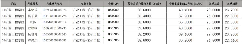 矿业工程学院2026年硕士研究生招生考试(矿业工程-采矿工程)第一次调剂复试成绩