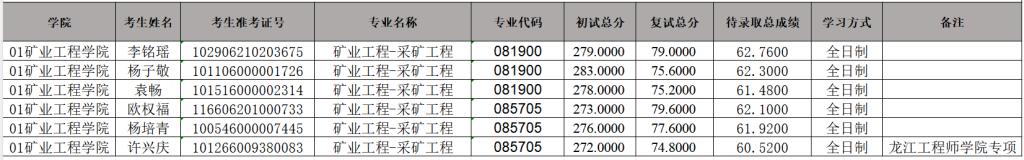 矿业工程学院2026年硕士研究生招生考试(矿业工程-采矿工程)第一次调剂待录取名单