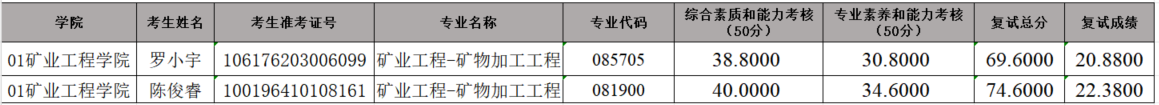 矿业工程学院2026年硕士研究生招生考试(矿业工程-矿物加工工程)第三次调剂复试成绩