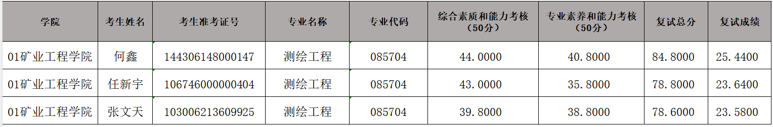 矿业工程学院2026年硕士研究生招生考试(测绘工程)复试成绩