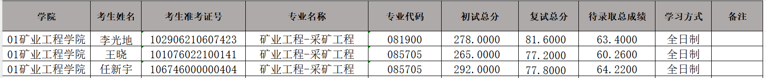 矿业工程学院2026年硕士研究生招生考试(矿业工程采矿工程)待录取名单